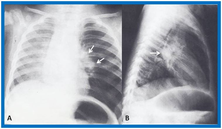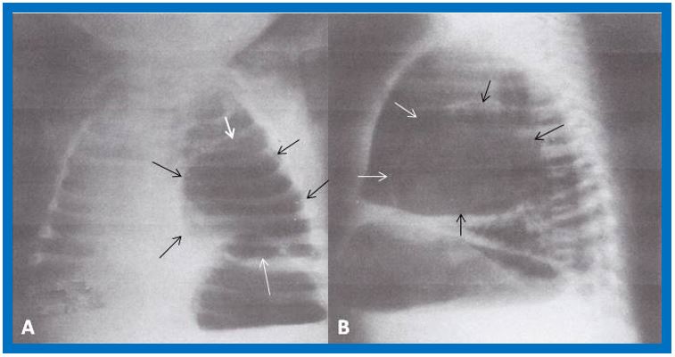 age of 31 days, tachypnea and recurrent apnea with cyanosis developed. Auscultation revealed bilateral rales in the chest, again necessitating resuscitation with O2, administered by bag and mask. Chest x-ray (Figure 2)